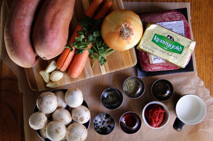 Shopping List:[br][br]4 large sweet potatoes[br]1 can coconut milk[br]Butter or olive oil[br]3 carrots[br]Garlic[br]1 yellow onion[br]1 8.5 oz package of white button mushrooms[br]2 lbs grass fed ground beef – Regular beef is okay too :)[br]1 can tomato paste [br]thyme – dried or fresh[br]oregano – dried or fresh[br]basil – dried or fresh[br]paprika[br]cinnamon[br]salt [br]pepper