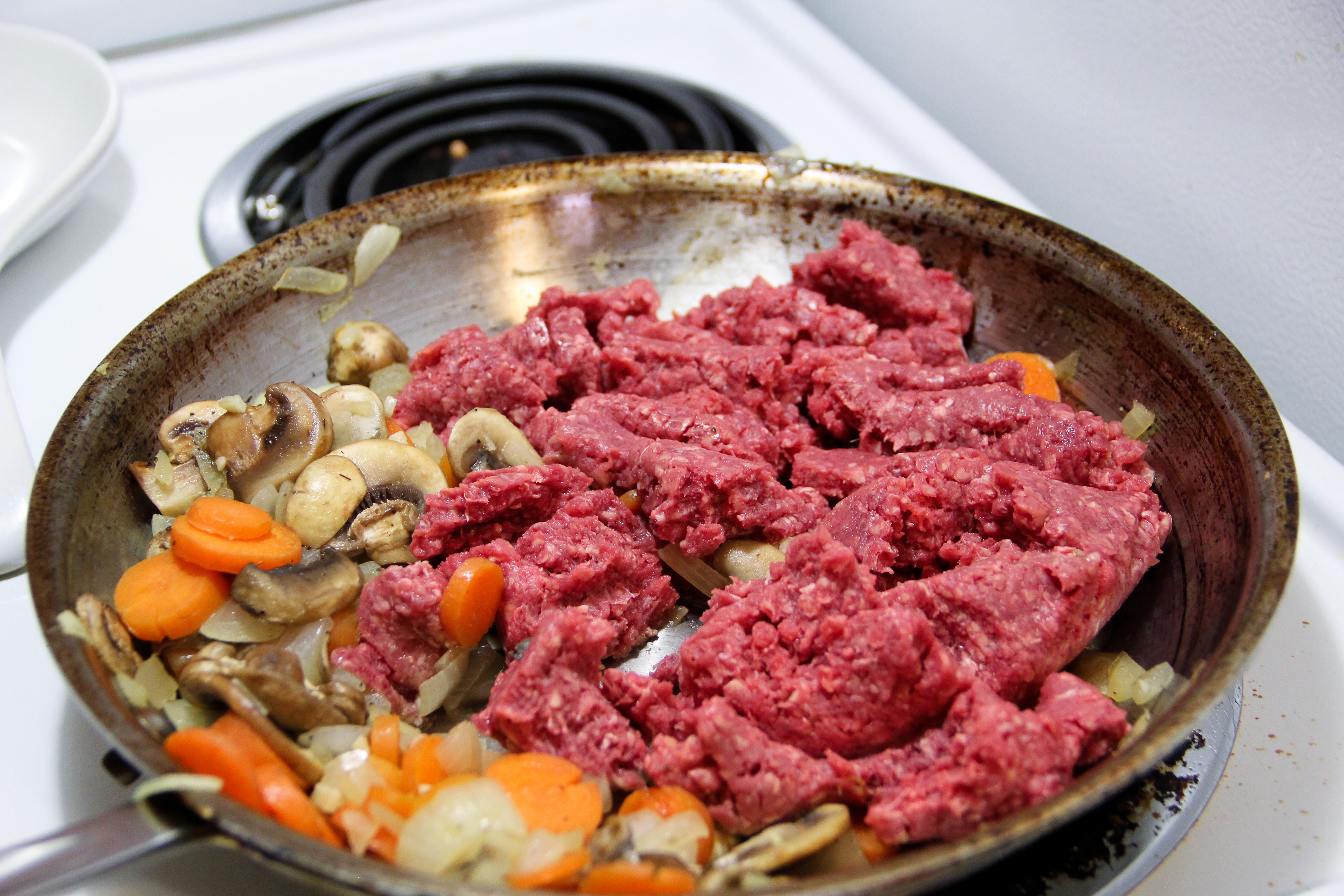 11. We’ll cook the other pound of ground beef with the other veggies once the first batch is done. If your pan isn’t big enough, it’s okay to cook this in two separate batches, even if your first batch gets cold while the second is cooking. We’re going to put all our stuff in a pan and bake it after we finish cooking it here, so it’s okay if it cools off a bit. Once you’ve separated half the veggies, add the meat. Break up that lumping lump of meat and mix it in with the veggies like so:
