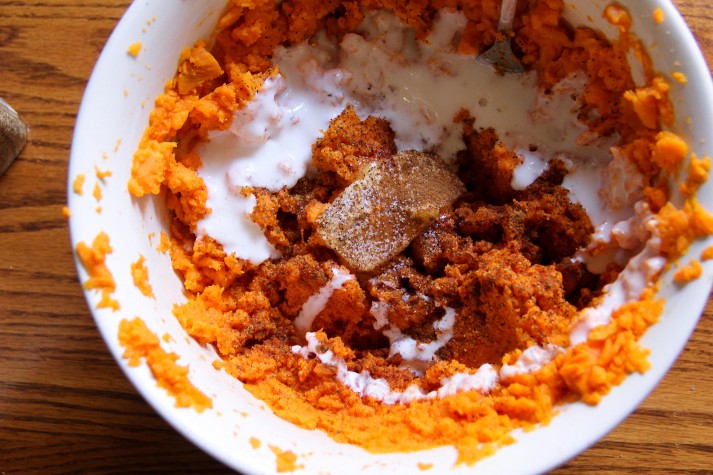 18. Once those ‘taters are nice and smashed, it’s time to add your coconut milk and spices! Yum!