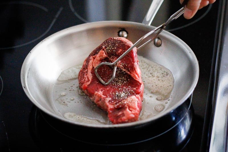 10. Remove your steak from the pan with your tongs and place it on a cutting board or plate. If you’re using the same board/plate from step 4 (seasoning), you’ll want to wash it first! No mixing cooked and raw surfaces!