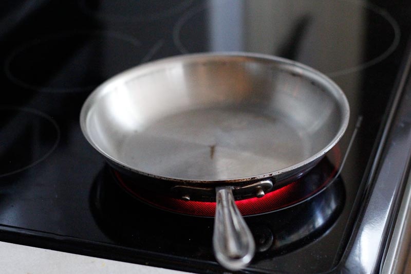2. Next, heat your pan and the oven. Set the oven to broil (or high, if that’s an option), and heat your pan on medium-high heat for about 5 minutes.