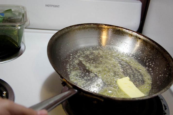 2) Pre-heat your pan over medium heat. You’ll want to heat the pan for about 5 minutes (depending on the power of your stove). Generally, if you hold your hand about 6 inches from the pan, you should be able to feel heat/warmth. This means your pan is ready for cookin!