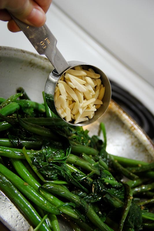 7) When the spinach has wilted and the green beans are a bright green, you’re almost done! Now we’ll add the lemon juice and almonds.