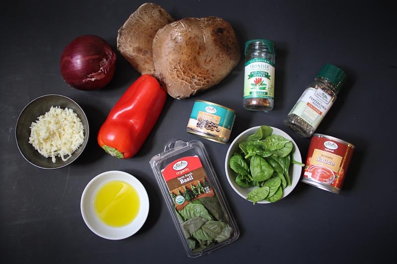 Shopping List[br]4 Portobello Mushrooms [br]1 can or jar of tomato sauce[br]Italian Spices[br]Red Pepper Flakes[br]1 bulb Garlic or a jar of minced garlic[br]Olive Oil[br]Balsamic Vinegar [br]Bunch of Spinach[br]1 Bell Pepper [br]Can or jar of black olives (or bulk olives from an olive bar) [br]1 Red Onion[br]Mozzarella cheese (optional)[br]Fresh Basil (optional)[br]Italian sausage – ground or in links – (optional)