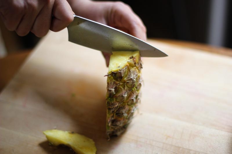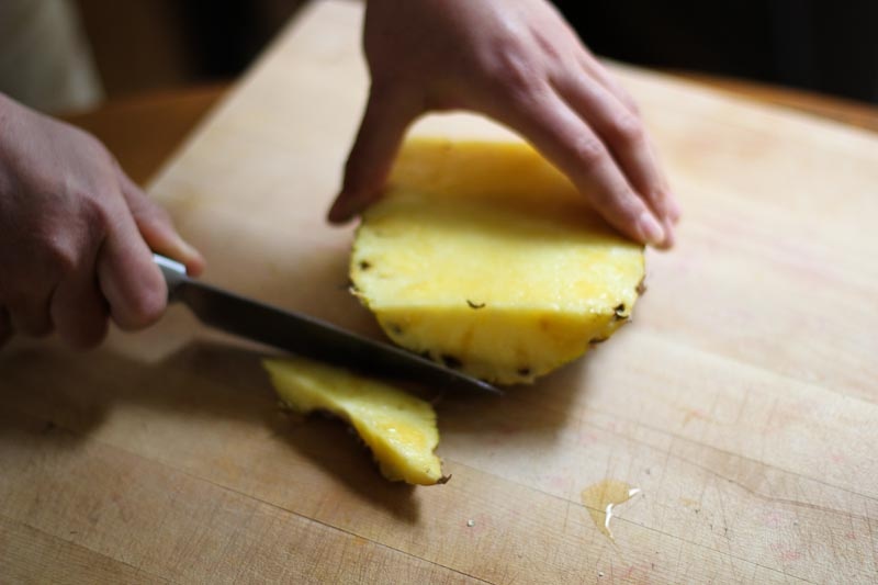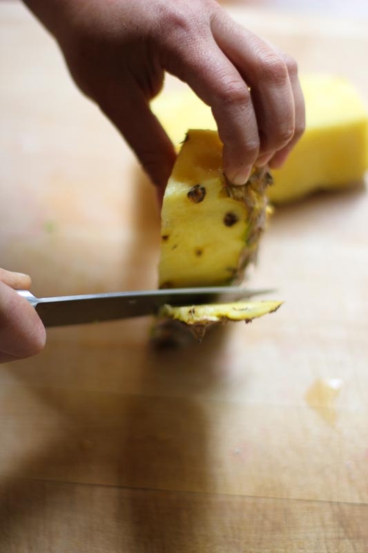 If you have some indentations with the skin still in them (eyes) in your pineapple, that’s okay. This is edible, but not a nice texture to chew. You can carefully cut these pieces out with a smaller knife or chop them off after the next step.