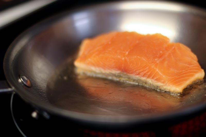 The thickest part of my salmon was about an inch. At the thinnest, it was maybe a quarter inch. That’s okay. I cooked each piece of fish individually because I had a small pan. If you have a larger pan, you can cook all your fish on it at once – just remember to watch them carefully because the thinner pieces will cook much faster than the thicker ones.