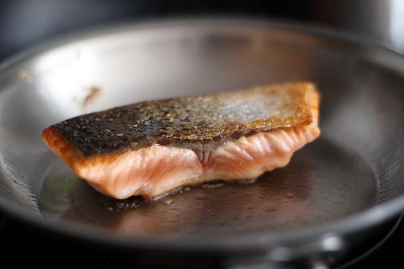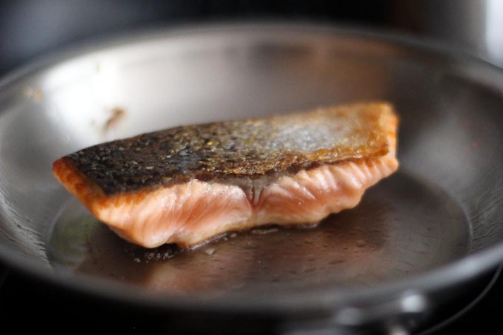 9. Let this side of the fish cook for about 6 minutes. You’ll be able to see the salmon cook as the side nearest to the pan changes from a dark translucent pink to a pastel orange-y color. Press down on the salmon a couple times during cooking to keep the skin from curling up.
