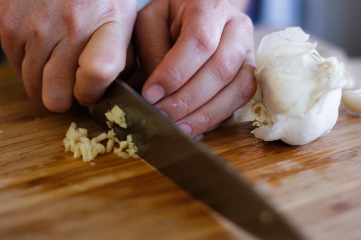 For the garlic, remember the difference between cloves and bulbs? Cloves are the little guys inside the bulbs. To peel, smash the clove under the flat side of a knife and easily pull away the paper-like wrapping. Then cut the garlic super small.
