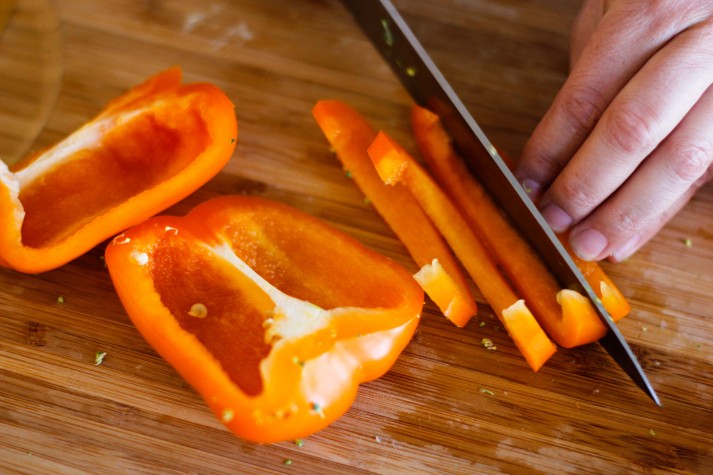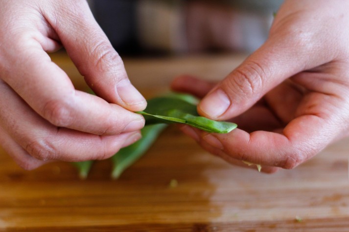 If using snow peas, you don’t have to chop them, but do remember to remove the fibrous string located on the inside of the veggie (explained in the first 30 seconds of this video).