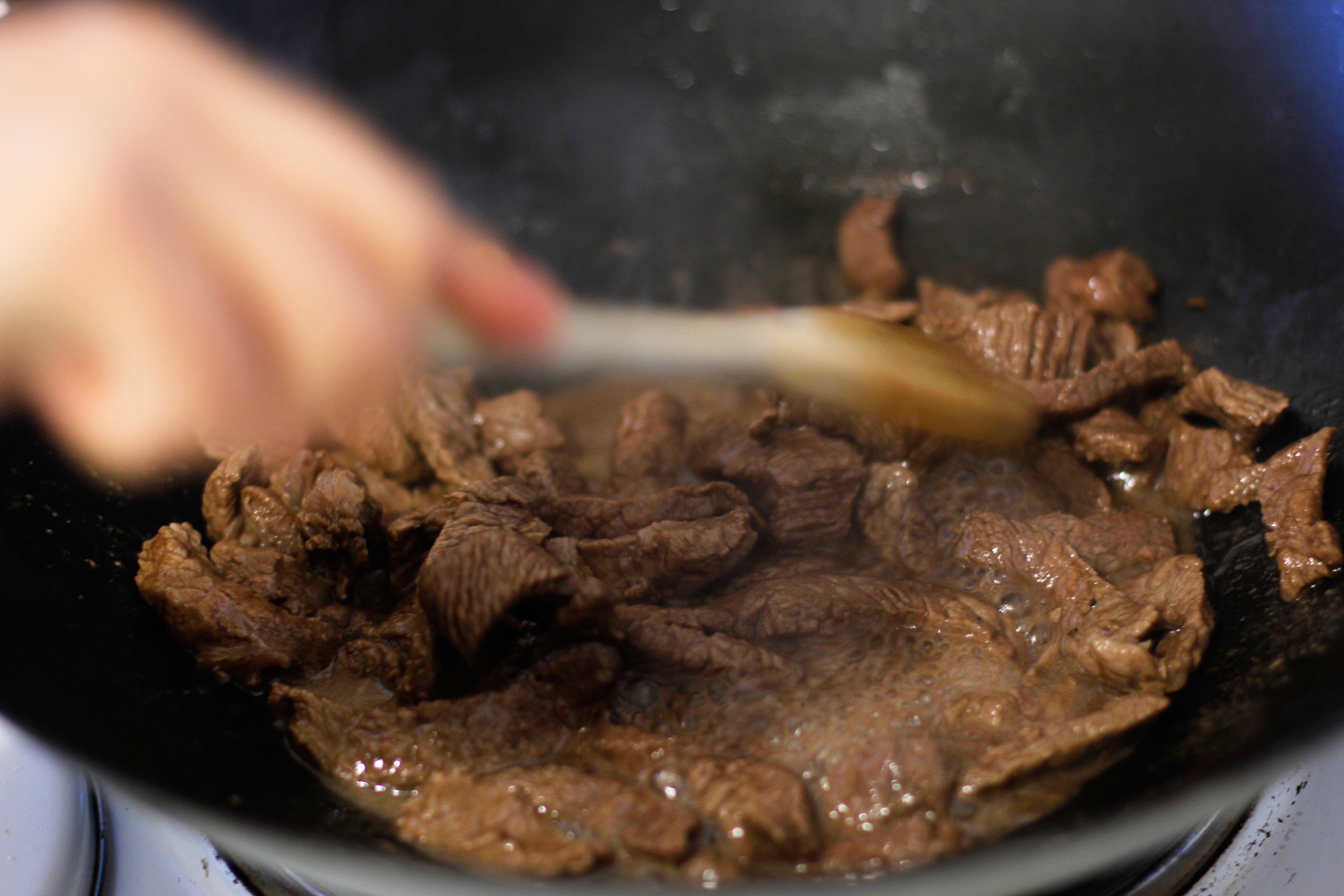 - toss in your sliced up meats and sauté them until browned and just cooked through (about 10-15 minutes for beef, pork and chicken, 5 minutes for shrimp). Once it’s done cooking, dump the protein into a clean bowl.