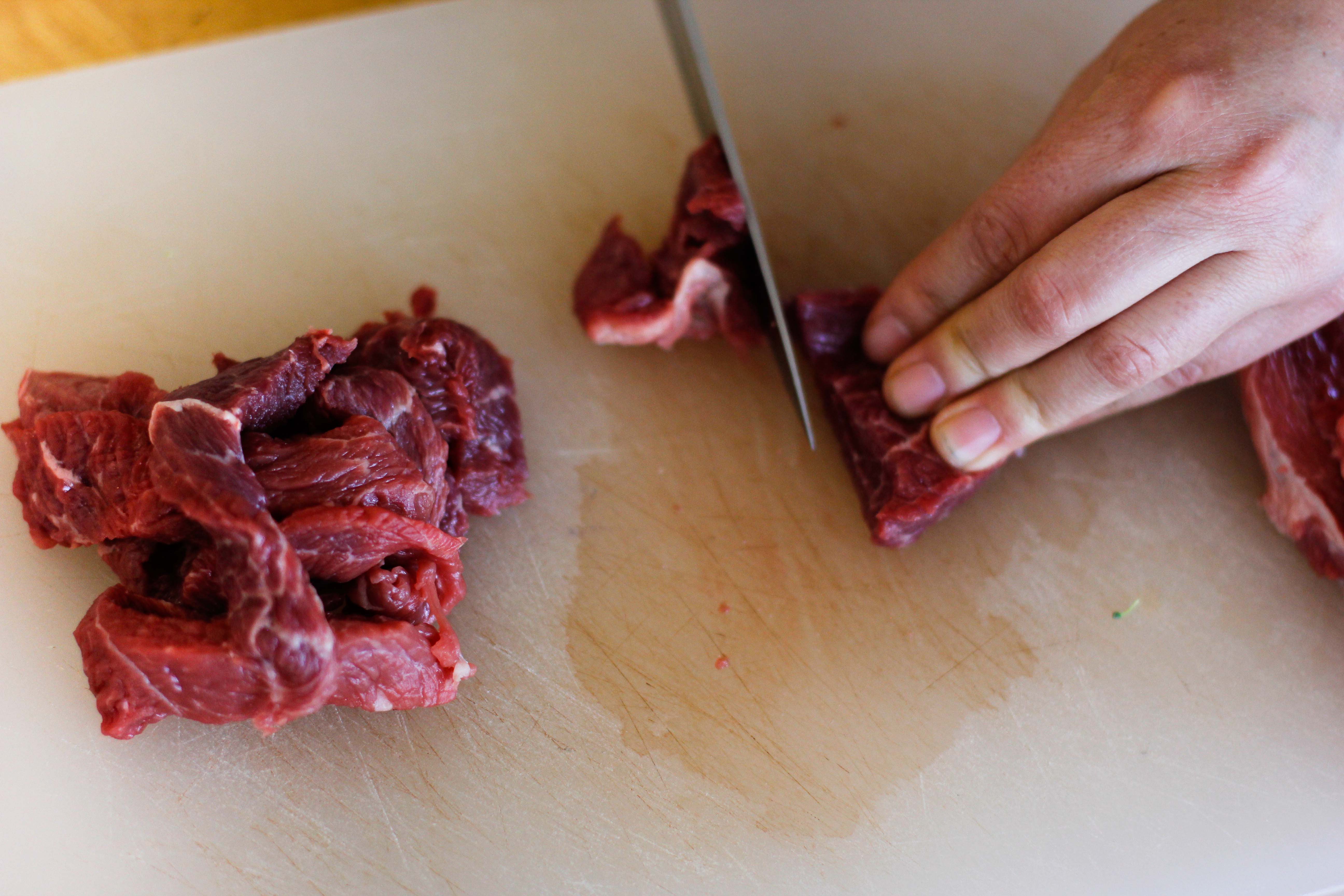 4. Slice your meat and/or peel, de-vein, and wash your shrimp. Thin slices are best for stir frying as they’ll cook faster.