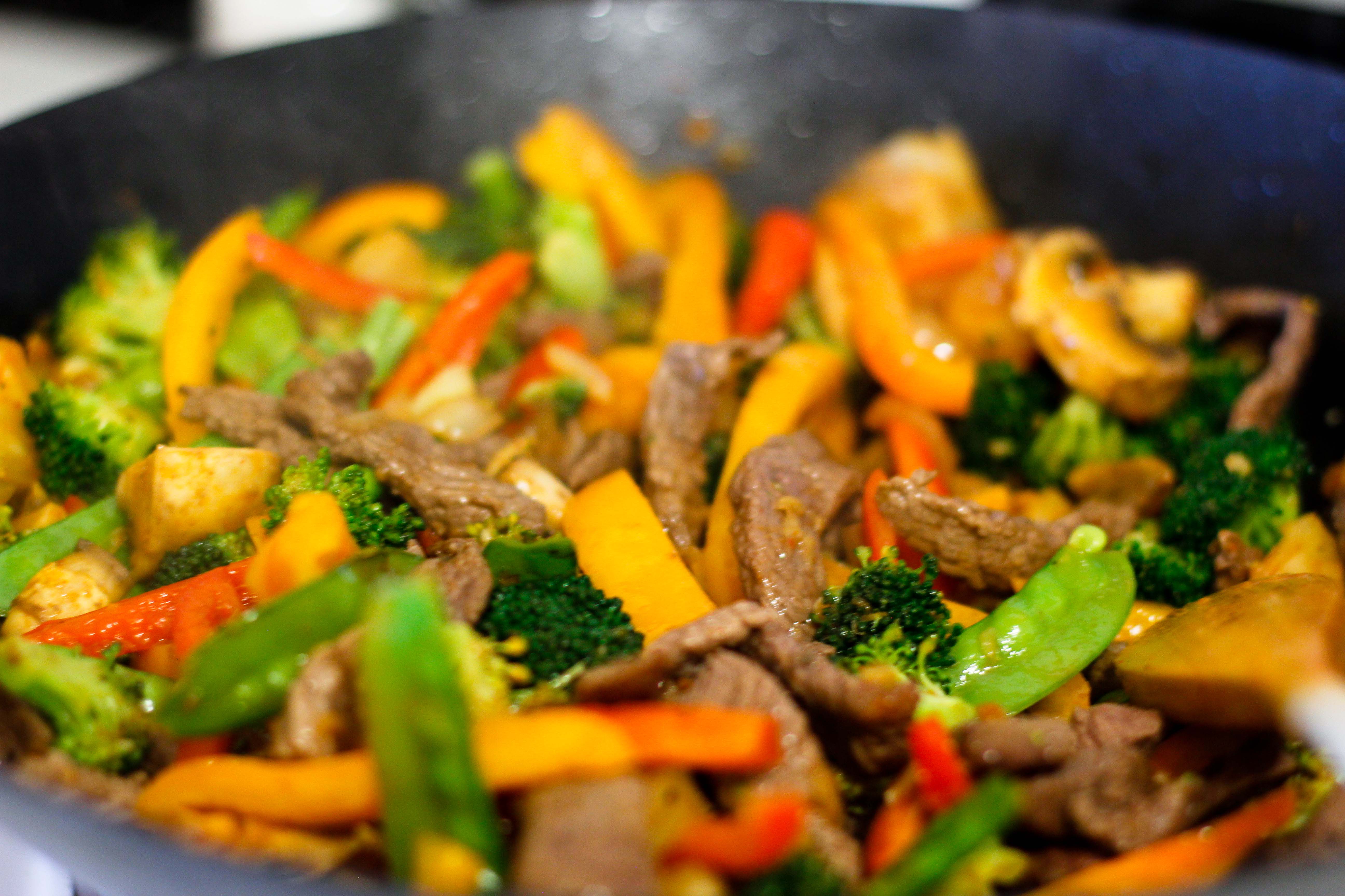 - 1lb protein (453g)– chicken, beef, shrimp, pork, or a combination of your favorites – slice the land animal(s) into thin strips. If you’re using shrimp, leave them whole – just wash and peel those guys. I’m using beef in my recipe because that’s what my heart wants. Always do what your heart tells you.