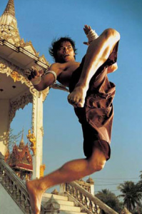 Evan: Last year, my blood pressure hit the ‘pre-hypertension’ range and the only really effective way to control it was regular exercise. My wife and I began walking our dog every morning as a way to add some more exercise into our daily routine. One morning I found a postcard on the trail with a picture of Tony Jaa (pictured right) in the middle of a flying knee strike! It was for a local gym that was running Muay Thai ‘boot camps’ – 5 days a week at 6am for 4 weeks. I’d done a couple of years of Karate when I was 10 and had always wanted to give martial arts another try, so I figured the boot camp was a good way to try something – after all if I didn’t like it it was only 4 weeks.