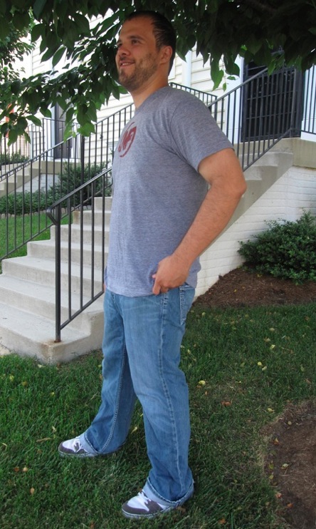 Holy crap, not only did Tony stay self-motivated for four months, but he worked his way through almost all of the different levels of the ebook, and made his own NERD FITNESS t-shirt. I remember reading Tony’s email thinking “this guy is THE MAN.” I was so pleasantly surprised and excited about Tony’s story that I told him I’d send him a free Nerd Fitness shirt so he didn’t have to keep wearing his fake shirt 🙂